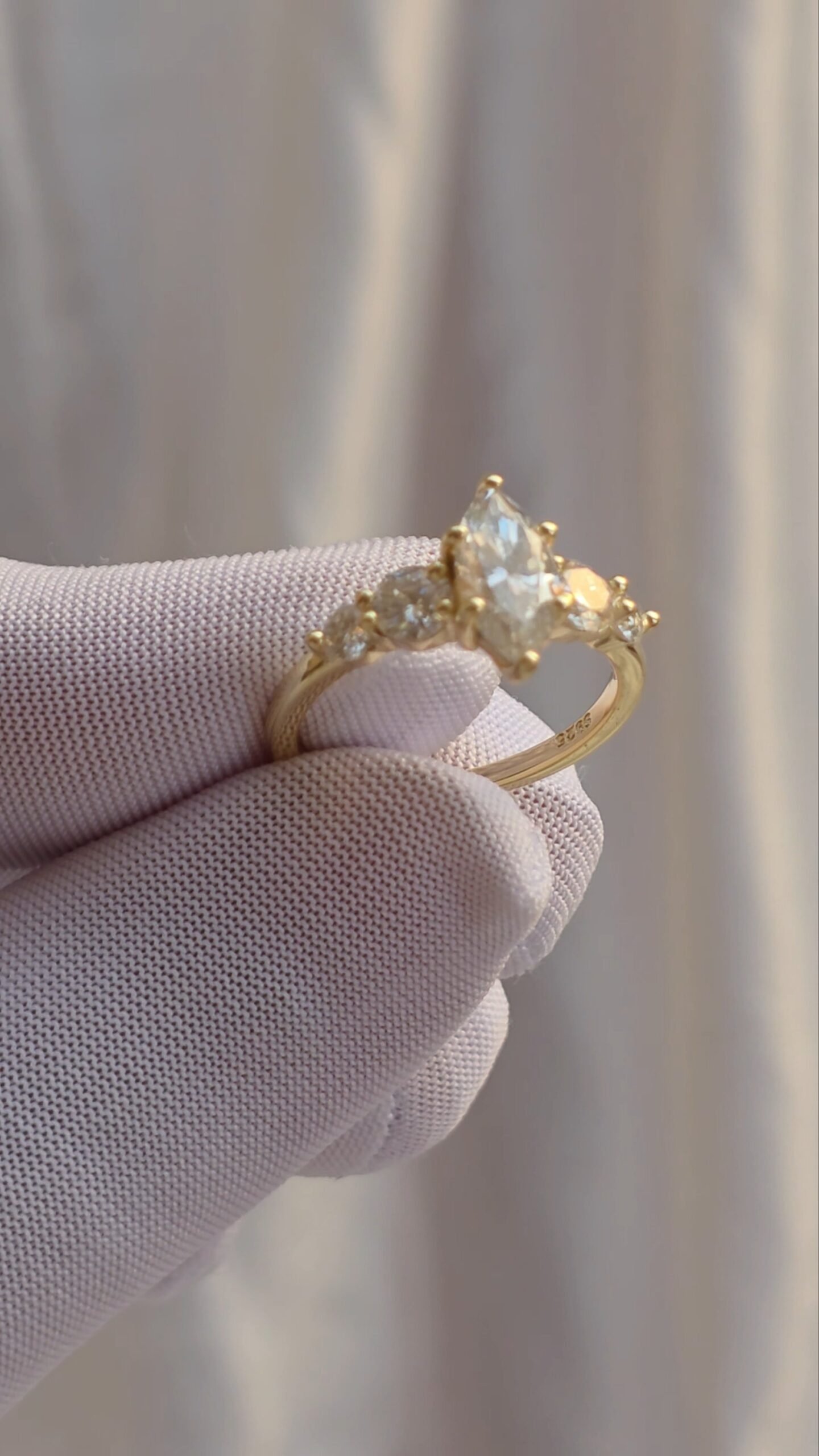 Elegant five-stone moissanite ring featuring a marquise-shaped center stone, framed by four round side stones in a warm 14K light gold–plated finish.
